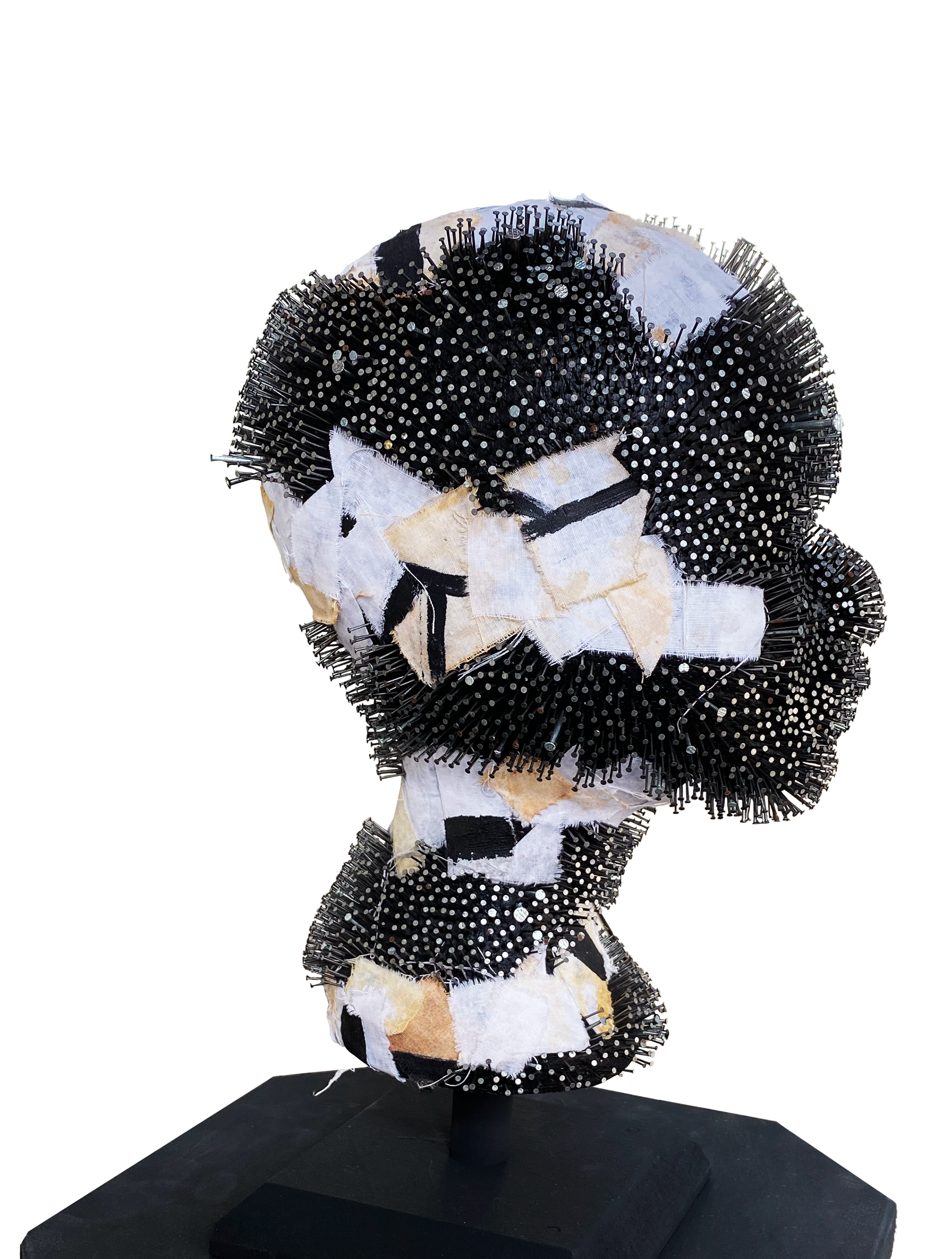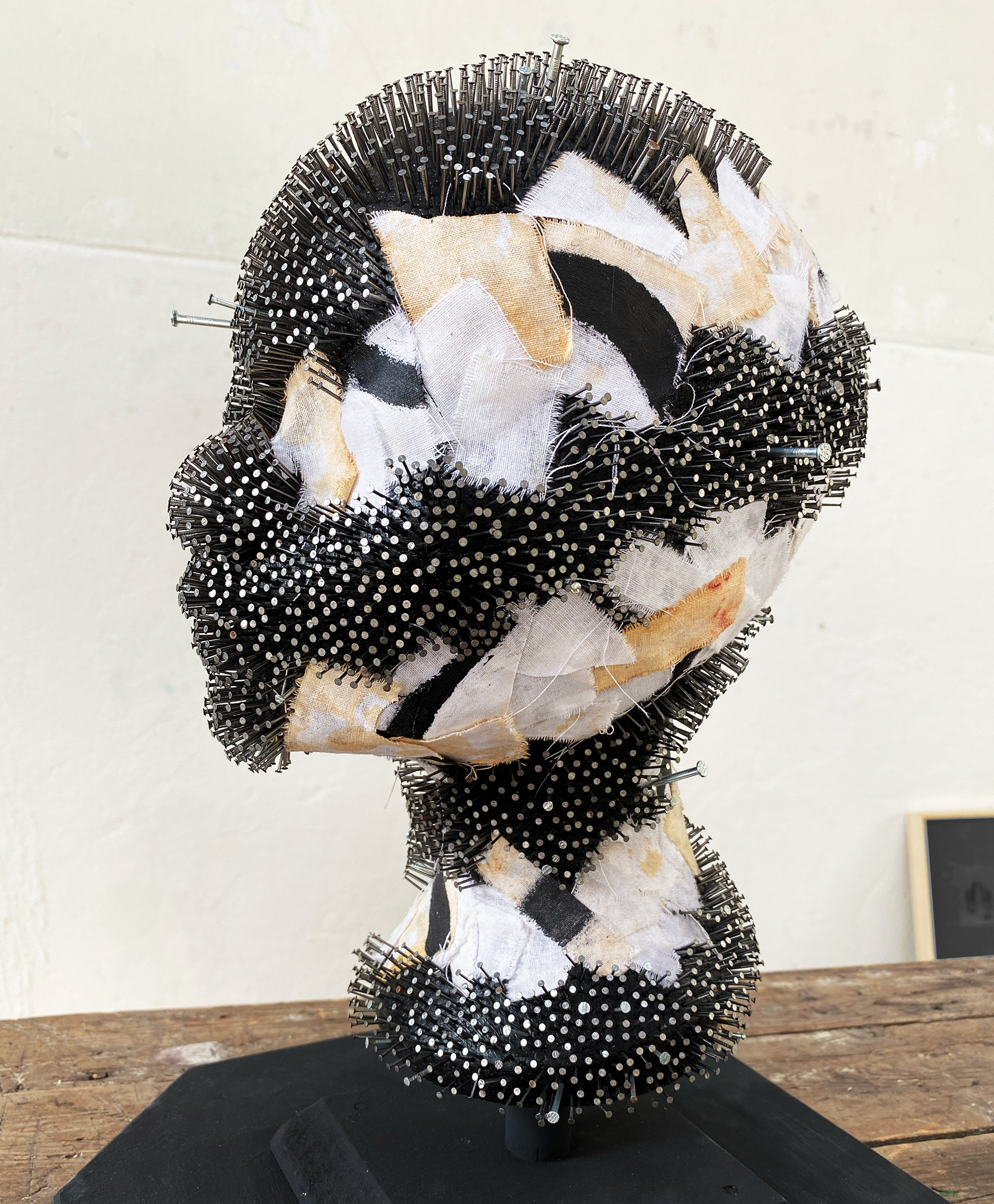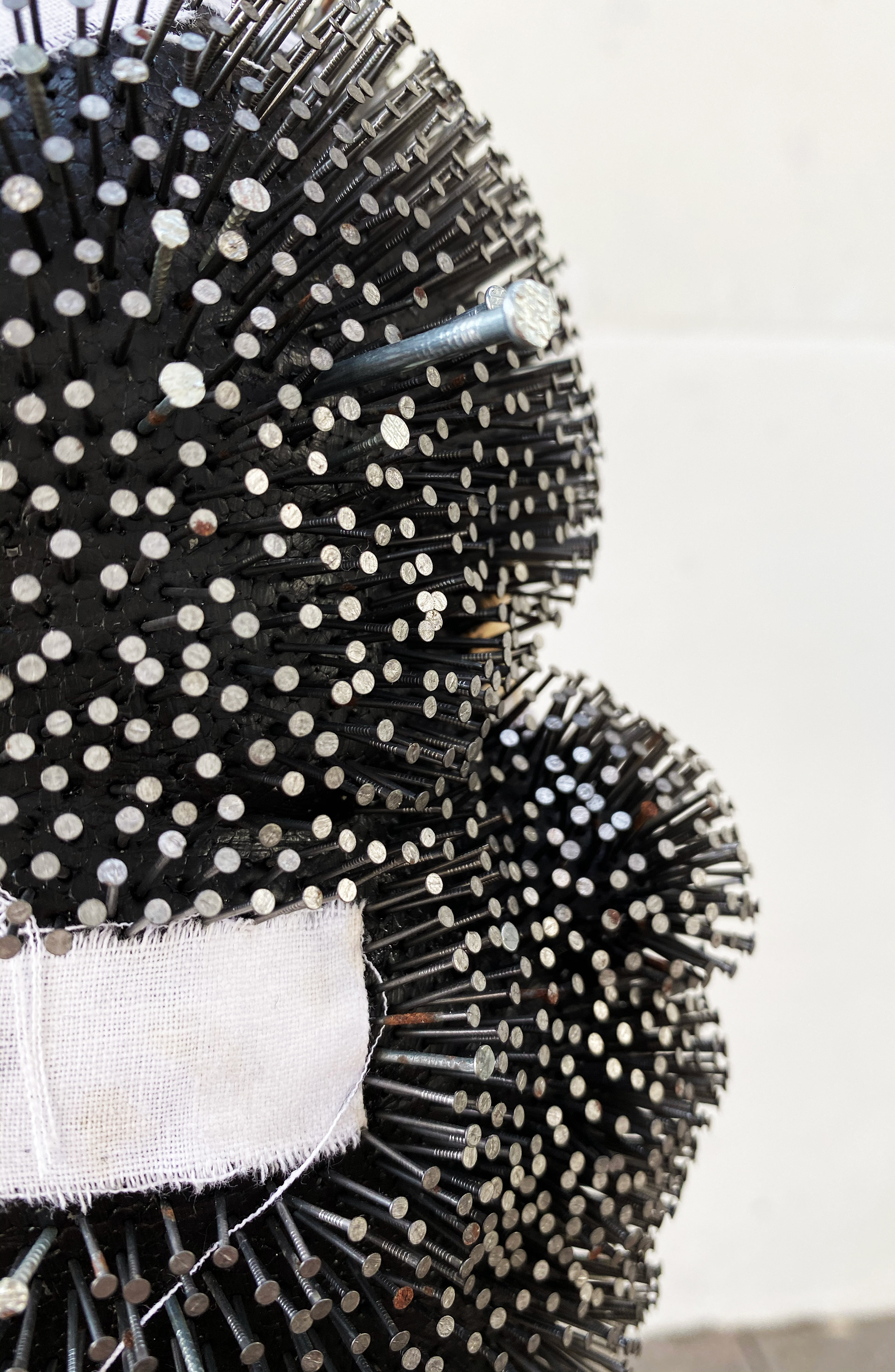 Three-dimensional silhouette of a head wrapped in torn cloth and iron nails