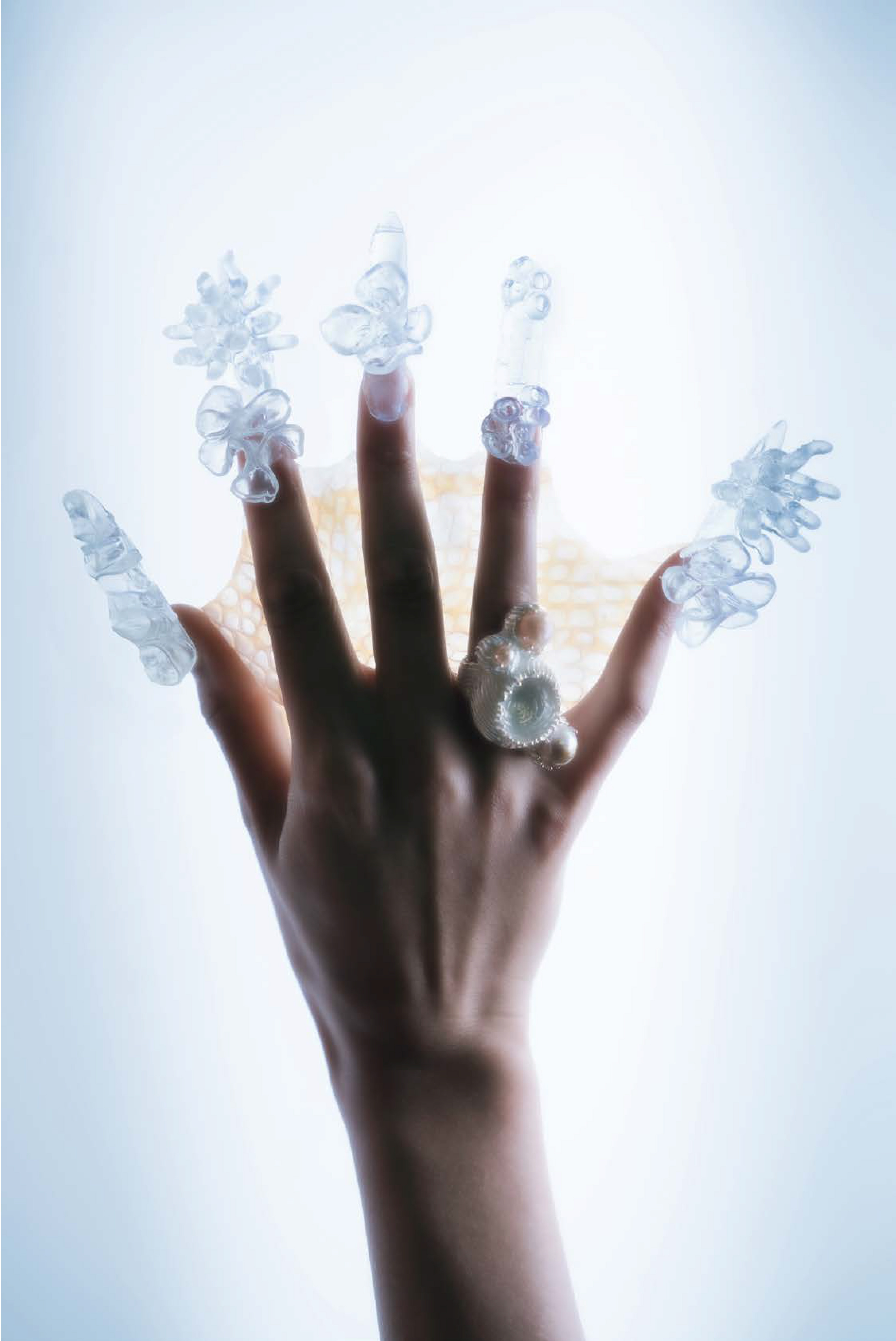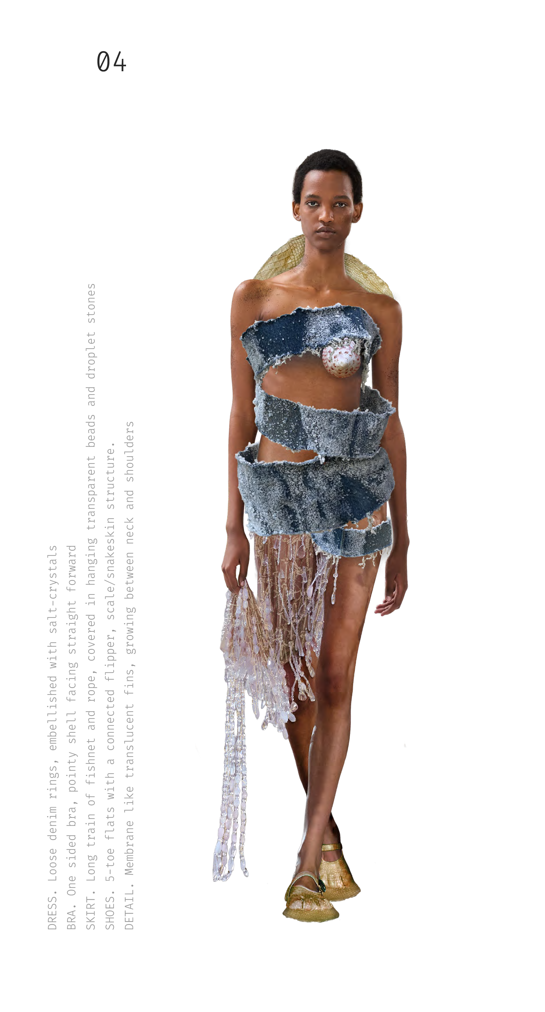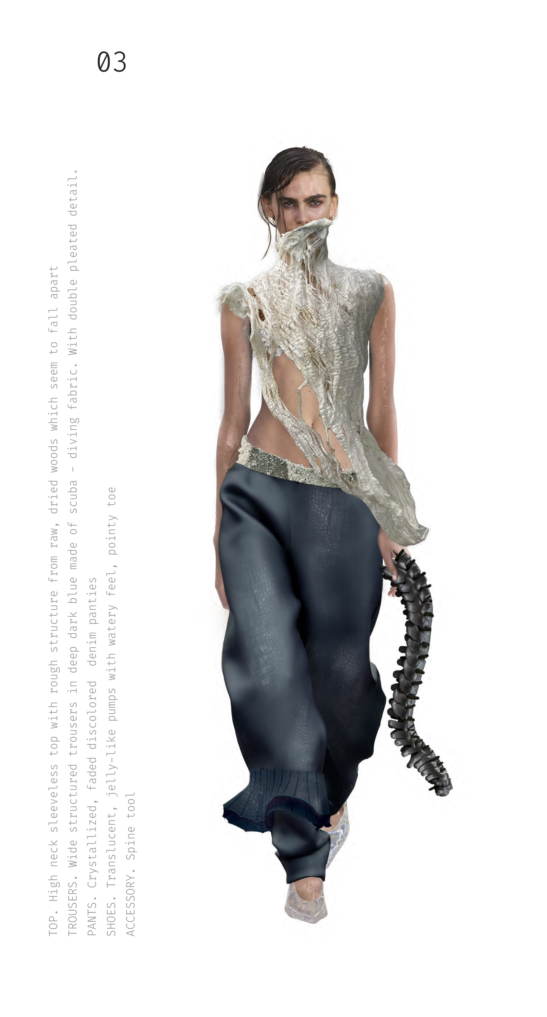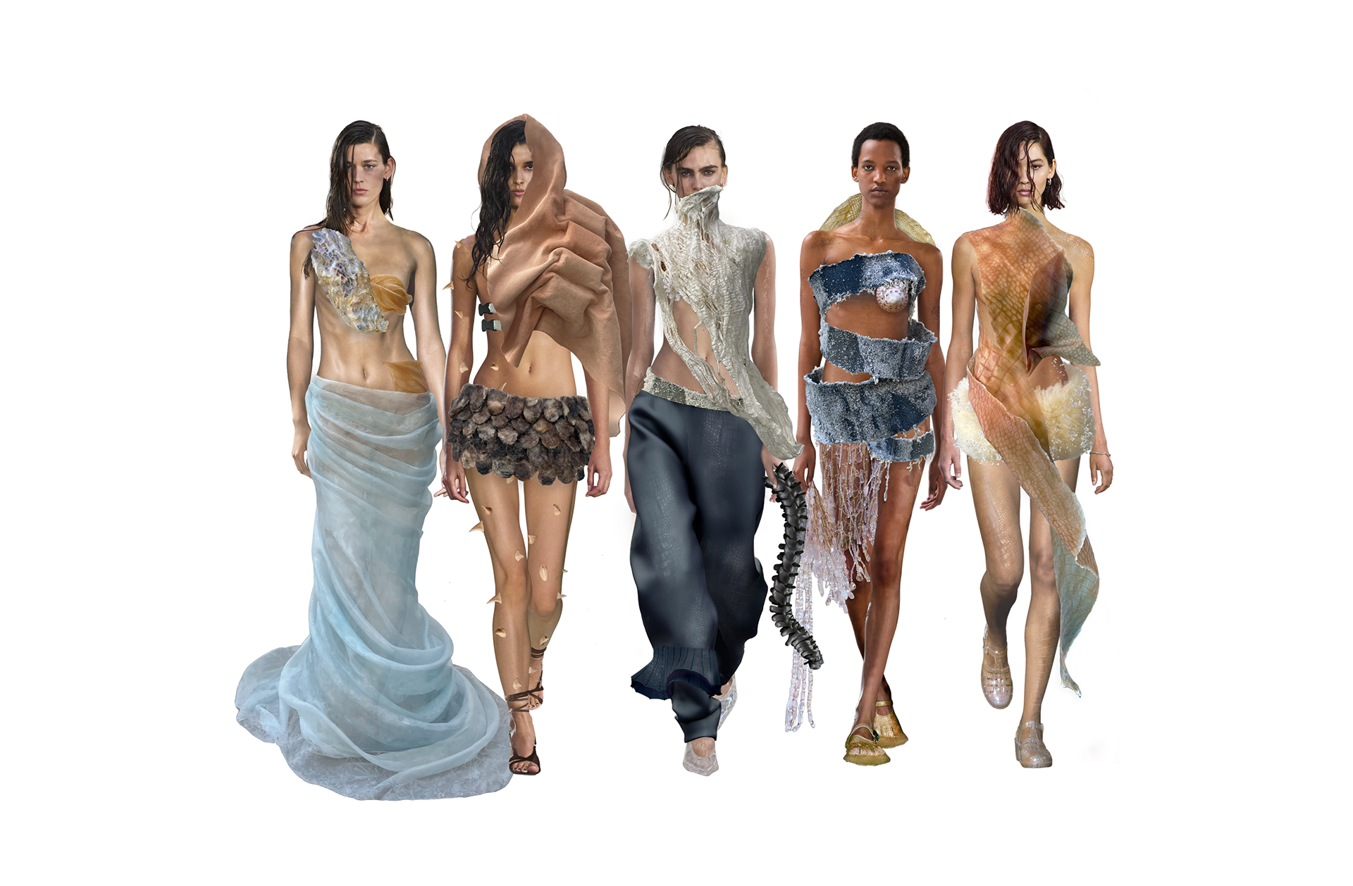 The collection embodies a trend scenario, a speculative proposition for an alternative future. A new state of being, one where we do not place ourselves above nature, but learn to exist within it. An echo of the waters from which we originate.